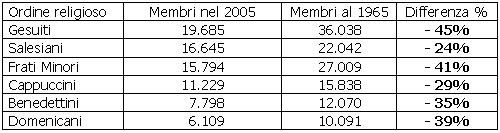 I religiosi in totale erano 329.799 nel 1965, 40 anni dopo la chiusura del Concilio ne restavano 214.903. Ci sono delle eccezioni nella «tempesta della crisi post-conciliare» (p. 291)? Sui 205 istituti analizzati dall’autore 55 hanno avuto degli aumenti, più o meno consistenti. Ci riesce molto difficile caratterizzare questi istituti-eccezione, ma ci pare che di norma essi siano di recente fondazione (con l’eccezione dei carmelitani), spesso persino successiva al Concilio e con una marcata identità, con alcune differenti peculiarità.